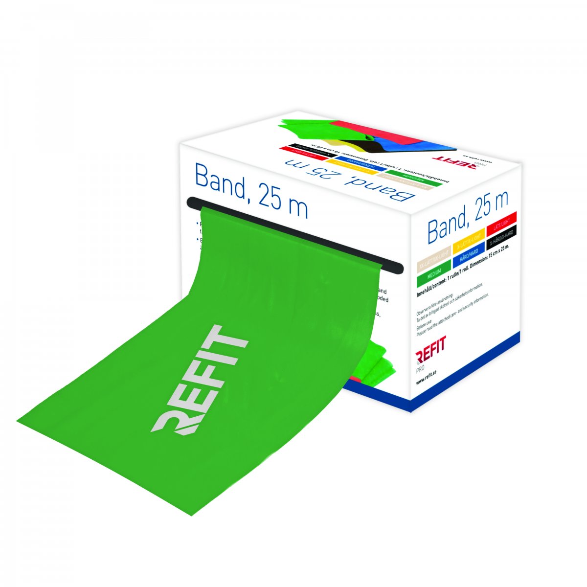Refit Band är effektiva för rehabilitering, flexibilitet och generell träning.De är mjuka nog för att rehabilitera en skada, men ger samtidigt motståndnog att tona, forma och stärka kroppen.Används bland annat inom pilates och yoga. 15 cm breda.Grönt band, medium motstånd